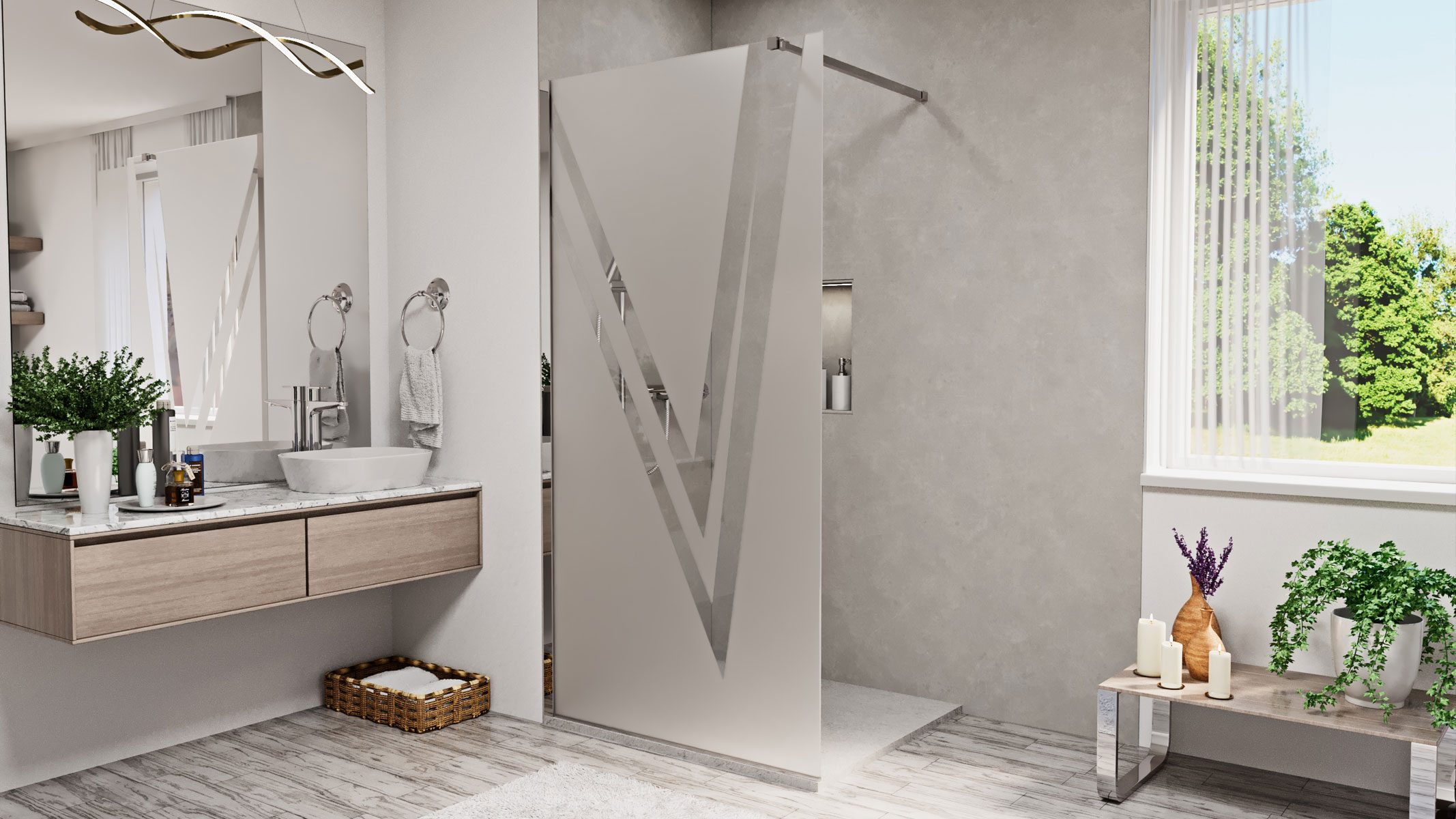 A N-smart Frida Victory walk-in zuhanyfal 100×200 cm méretben modern és praktikus megoldás a stílusos fürdőszobákhoz. A V-mintás dekorüveg elegáns megjelenést kölcsönöz, míg a nyitott kialakítás kényelmes belépést biztosít. Az 8 mm vastag, edzett biztonsági üveg strapabíró, hosszú távon is megbízható választás, amely ellenáll a mindennapos igénybevételnek.