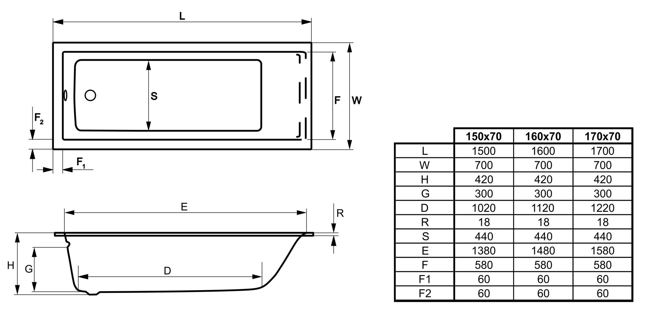 Niwell Sofi slim egyenes kád – 150×70 cm, modern design, 42 cm mélységgel