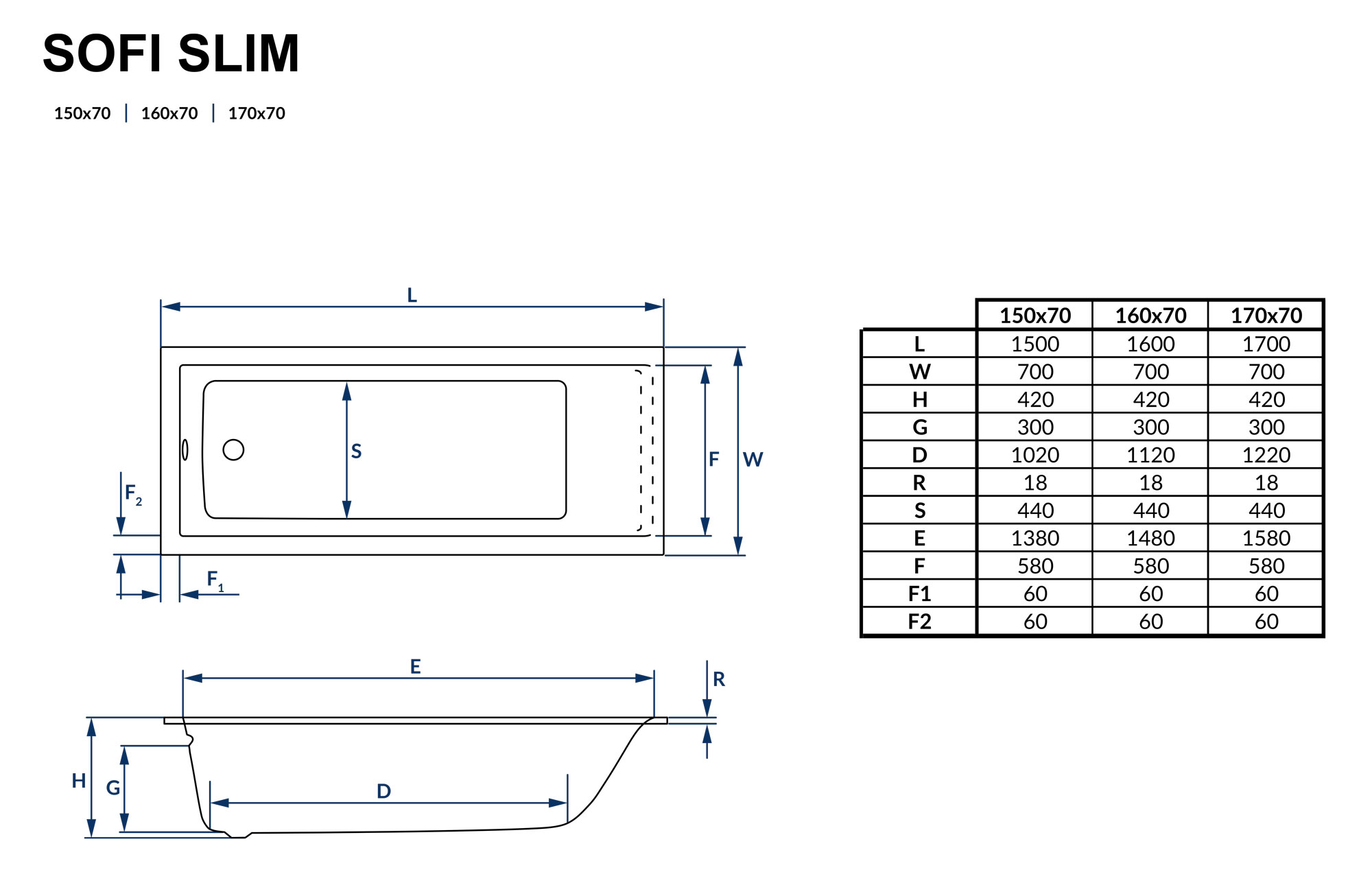A Niwell Luxury Sofi slim egyenes kád 160×70 cm-es méretével és 42 cm-es mélységével tökéletes választás a modern, letisztult fürdőszobákhoz. A mindössze 18 mm vékony slim perem elegáns megjelenést kölcsönöz, miközben helytakarékos kialakítása kisebb terekben is ideálisan elhelyezhető.